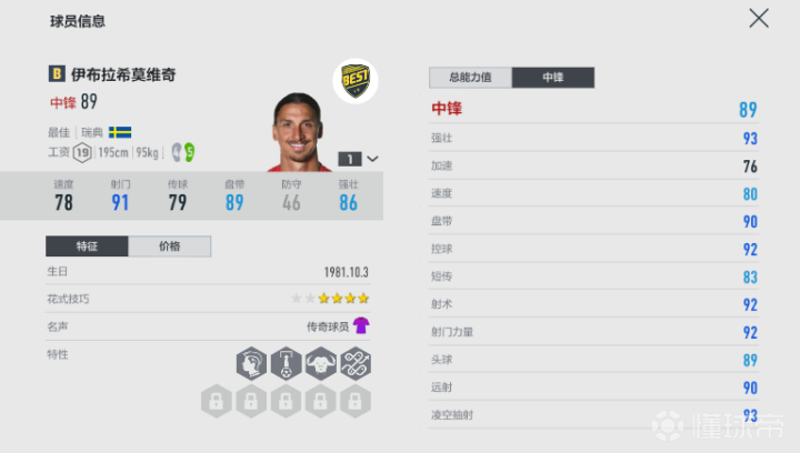 最后一位是“上帝”伊布,虽然我们很久没有看到伊布登场比赛了,但是在游戏中,他(总评89)的形象依旧高大,B卡的195身高足足比卢卡库高了5厘米,虽然速度慢了许多,但是出色的脚法及射门手段足以弥补。比起FIFA OL3中没有强力头球,FIFA OL4的伊布有了强力头球这一重要技能,全面的能力,让这张B卡伊布变成了破密集防守的神卡。
