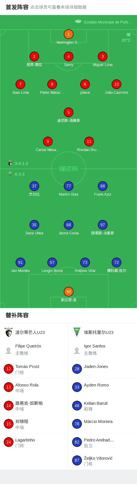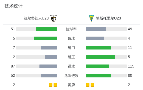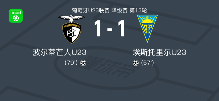 波尔蒂芒人U23 1-1埃斯托里尔U23战报bot @懂球帝03-24 01:00北京时间3月23日葡萄牙U23联赛 降级赛 第13轮,波尔蒂芒人U23主场对阵埃斯托里尔U23。最终比分波尔蒂芒人U23 1-1 埃斯托里尔U23。点击查看本场比赛详细数据>>精彩瞬间第57分钟,埃斯托里尔U23球员打入一球。第79分钟,波尔蒂芒人U23球员打入一球。 球队阵容 技术统计 展开更多