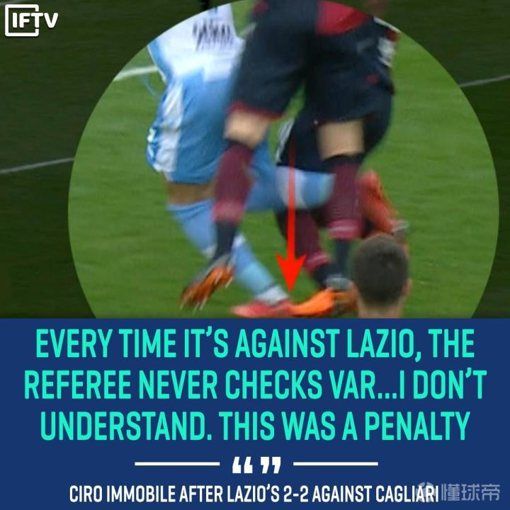 事实上本场比赛更想吐槽的是拉齐奥,本赛季蓝鹰已经多次遭遇到争议判罚,本场比赛也没有例外,因莫比莱在禁区内的一次被包夹防守后倒地,裁判没有表示也没有使用var,也难怪赛后帕罗洛表示球队被var无视了,因莫比莱更是直言var是“不存在的”。