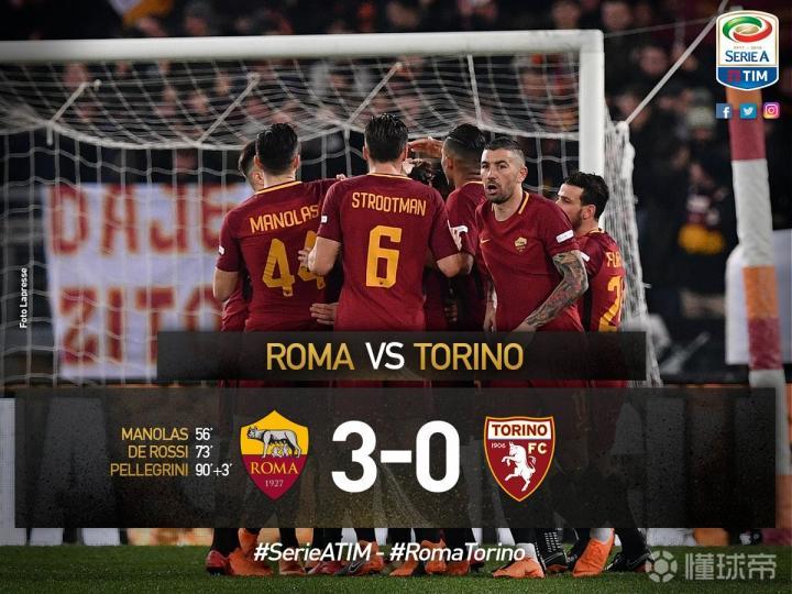 罗马的比赛是本轮首先进行的,红狼在主场3-0完胜了都灵,然后笑看着欧冠资格竞争对手拉齐奥和国际米兰纷纷丢分。