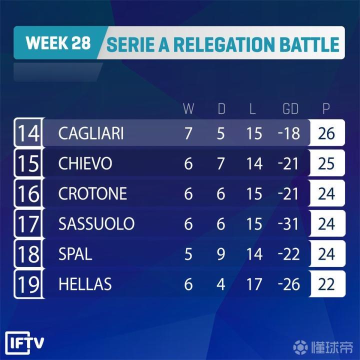 有绝杀的刺激,有人性的温暖,这样的意甲让人动容。联赛第28轮,意甲争冠形势突然逆转,欧冠资格争夺也再次波澜,相比之下最刺激的无疑是保级区,除去几乎预订降级名额的贝内文托,14名的卡利亚里积26分,19名的维罗纳积22分,意甲降级形势变得暗流涌动,谁都可能突然绝处逢生,谁都可能突然死亡。中下游好久没有出现如此乱象,也许这也会为领跑集团带来些许变数,毕竟他们之后遇见的每一个对手,都可能为了保级而拼尽全力。这样的意甲,谁都不知道下一刻会发生什么。