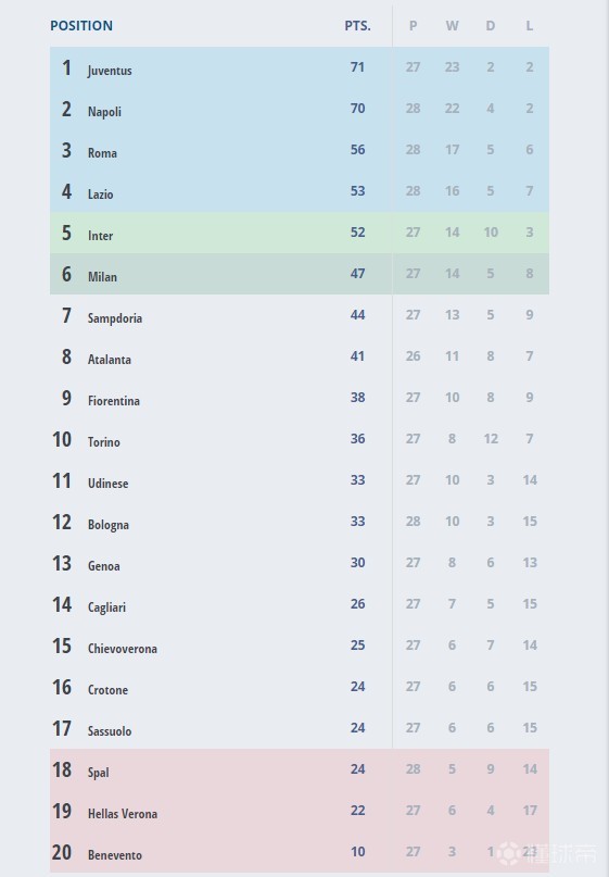 (28轮过后的意甲积分榜,部分球队少赛1-2场)