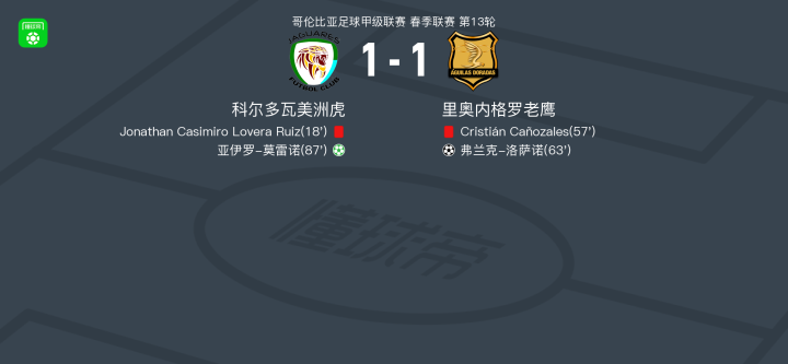 北京时间3月24日哥伦比亚足球甲级联赛 春季联赛 第13轮,科尔多瓦美洲虎主场对阵里奥内格罗老鹰。科尔多瓦美洲虎亚伊罗-莫雷诺破门。里奥内格罗老鹰弗兰克-洛萨诺破门。最终比分科尔多瓦美洲虎 1-1 里奥内格罗老鹰。