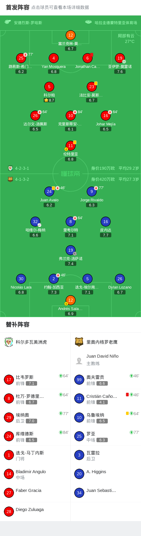 科尔多瓦美洲虎1-1里奥内格罗老鹰,弗兰克-洛萨诺破僵,亚伊罗-莫雷诺扳平