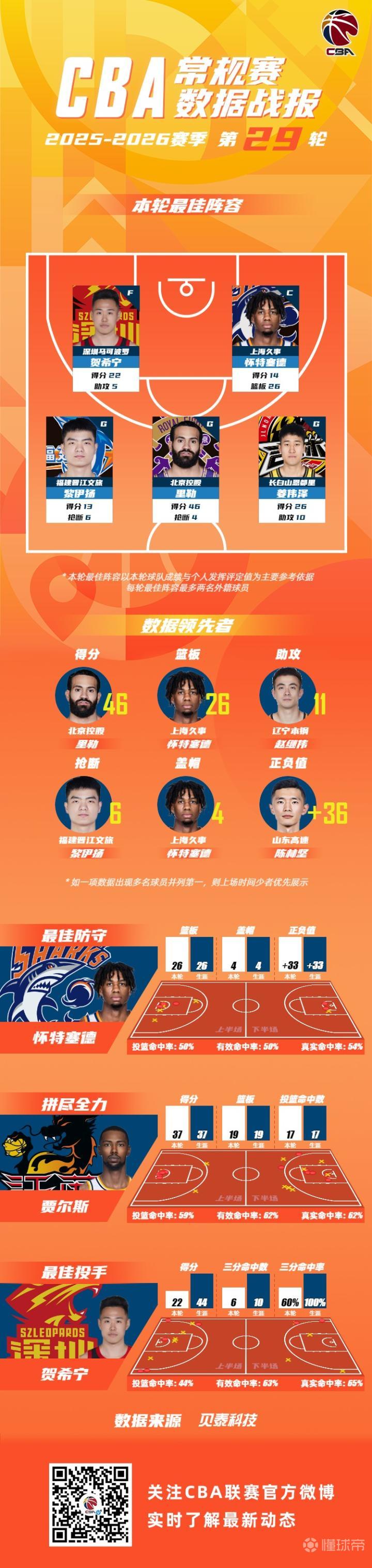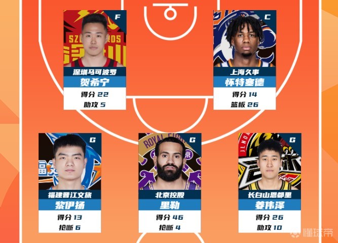 CBA第29轮最佳阵:贺希宁、怀特塞德、黎伊扬、里勒、姜伟泽