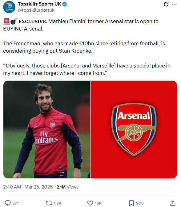 在这篇所谓的独家推文中,该媒体(并不可信)引用了弗拉米尼的话并表示,阿森纳和马赛在弗拉米尼心中都有很深的地位。