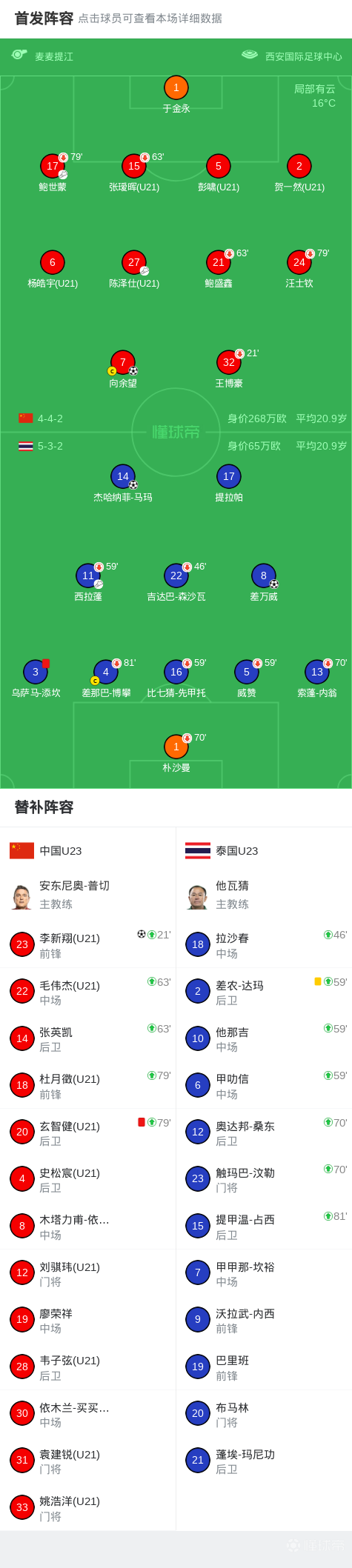 U23国足2-2泰国U23,王博豪伤退,向余望、李新翔破门