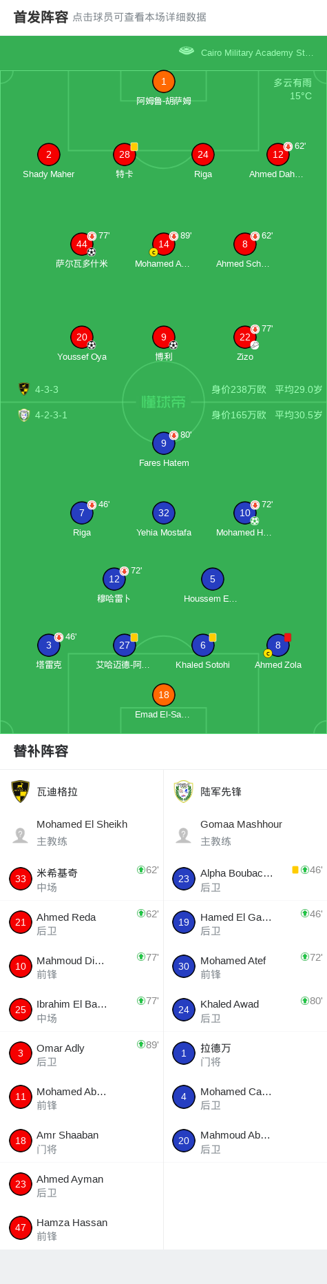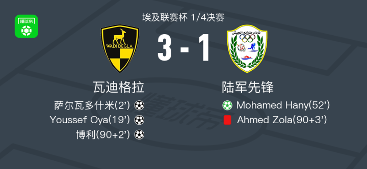 北京时间3月25日埃及联赛杯 1/4决赛,瓦迪格拉对阵陆军先锋。瓦迪格拉萨尔瓦多什米破门,Youssef Oya破门,博利破门。陆军先锋Mohamed Hany破门。最终比分瓦迪格拉 3-1 陆军先锋。