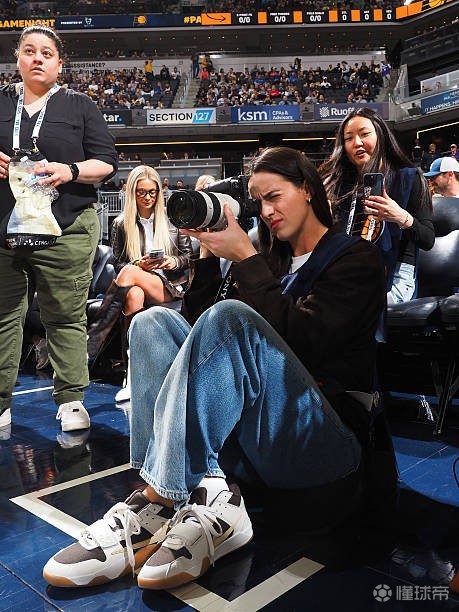 本场比赛,WNBA印第安纳狂热球星克拉克现场观赛,并担任场边摄影记者,她身着摄影记者马甲,手持搭配G大师70-200的索尼相机在场边摄影区进行拍摄。