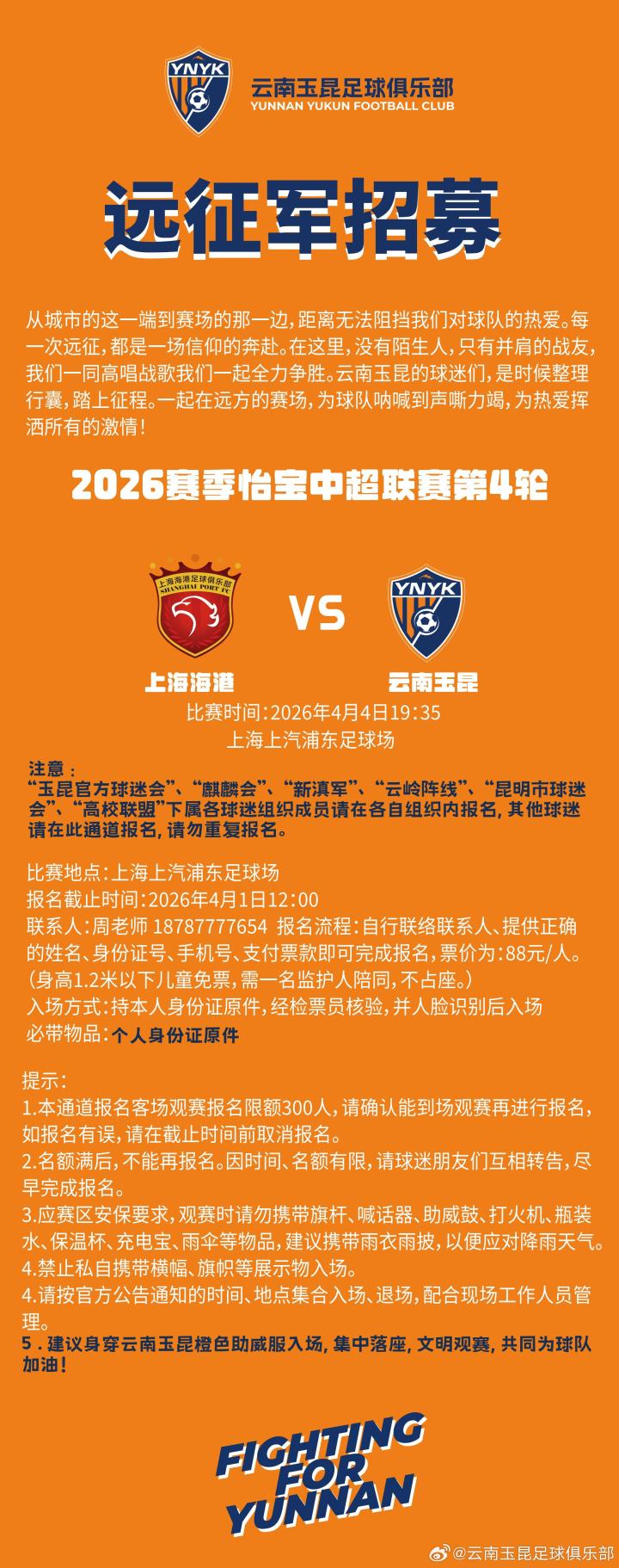 云南玉昆2026怡宝中超联赛第四轮客场远征招募公...