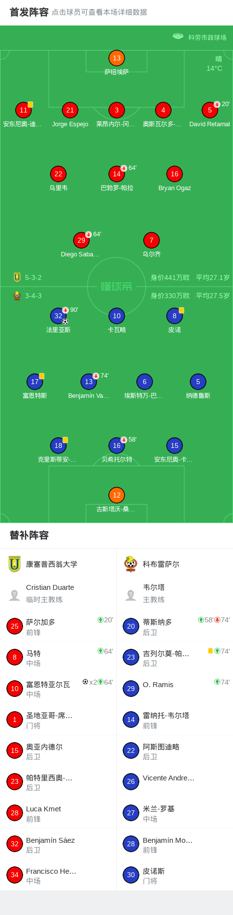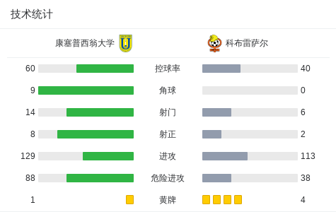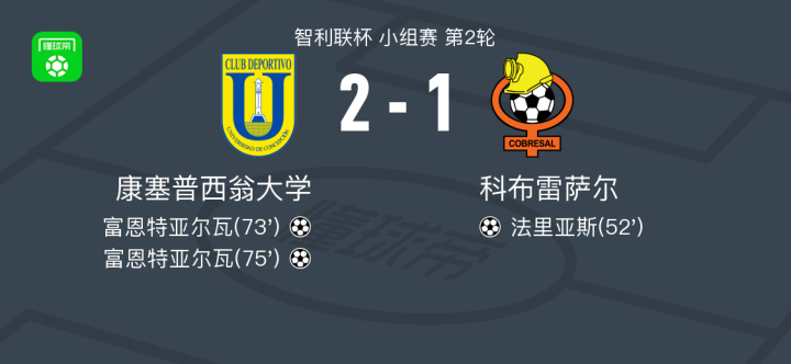 北京时间3月27日智利联杯 小组赛 第2轮,康塞普西翁大学对阵科布雷萨尔。康塞普西翁大学富恩特亚尔瓦梅开二度。科布雷萨尔法里亚斯破门。最终比分康塞普西翁大学 2-1 科布雷萨尔。