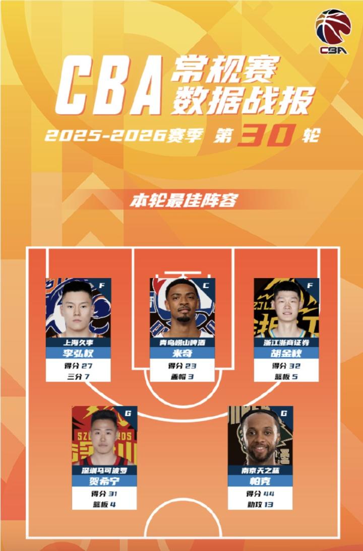 CBA第30轮最佳阵:李弘权、米奇、胡金秋、贺希宁、帕克入选