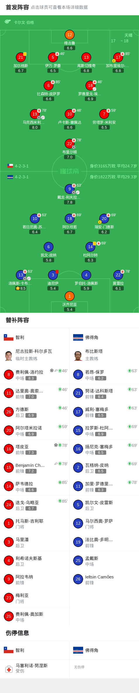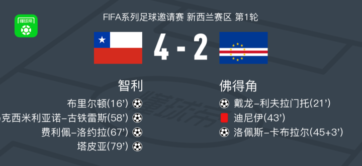 北京时间3月27日FIFA系列足球邀请赛 新西兰赛区 第1轮,智利对阵佛得角 。智利布里尔顿破门,马克西米利亚诺-古铁雷斯破门,费利佩-洛约拉破门,塔皮亚破门。佛得角 戴龙-利夫拉门托破门,洛佩斯-卡布拉尔破门。最终比分智利 4-2 佛得角 。