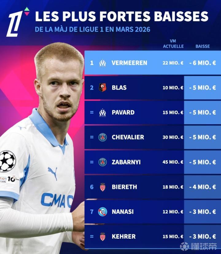德转更新法甲跌幅榜:帕瓦尔、舍瓦利耶、扎巴尔尼下跌500万