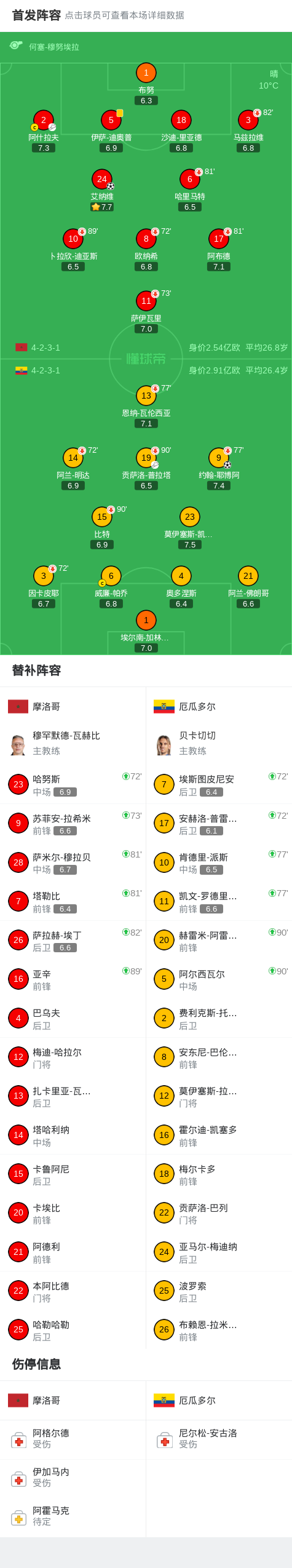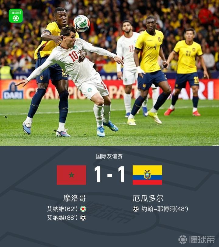 北京时间3月28日国际友谊赛,摩洛哥对阵厄瓜多尔。下半场耶博阿首开记录,艾纳维造点亲自主罚被扑,哈里马特补射进球因越位被吹,88分钟艾纳维头球破门扳平比分。最终比分摩洛哥 1-1 厄瓜多尔。