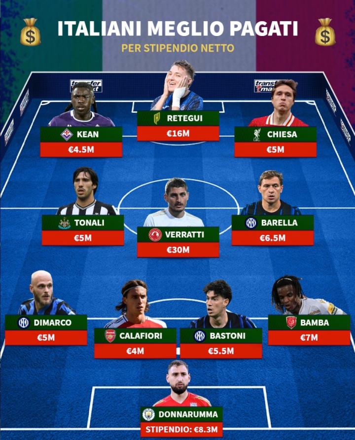 意大利球员年薪最高11人阵容:维拉蒂3000万领衔,雷特吉1600万