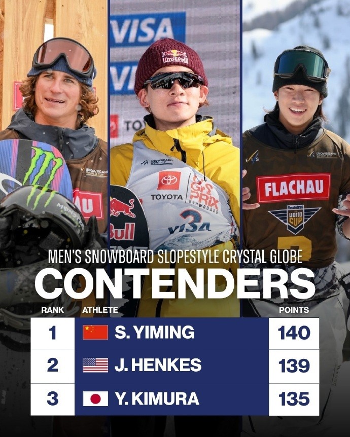 由于瑞士席尔瓦普拉纳站收官战因天气原因取消男子组比赛,本赛季积分榜就此定格,苏翊鸣凭借此前积累的稳定表现,以140分锁定榜首位置。