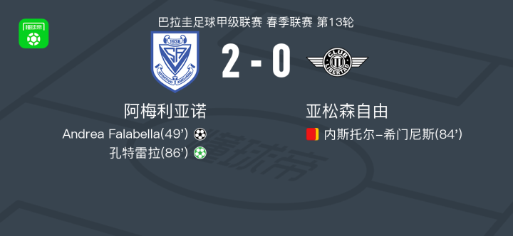 北京时间3月28日巴拉圭足球甲级联赛 春季联赛 第13轮,阿梅利亚诺主场对阵亚松森自由。阿梅利亚诺Andrea Falabella破门,孔特雷拉破门。最终比分阿梅利亚诺 2-0 亚松森自由。