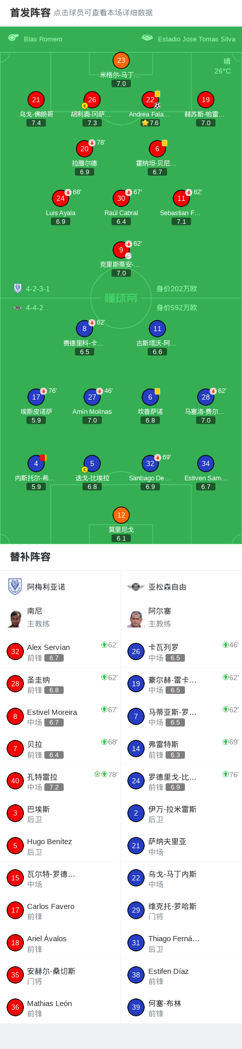 阿梅利亚诺2-0亚松森自由,Andrea Falabella建功,孔特雷拉锁定胜局