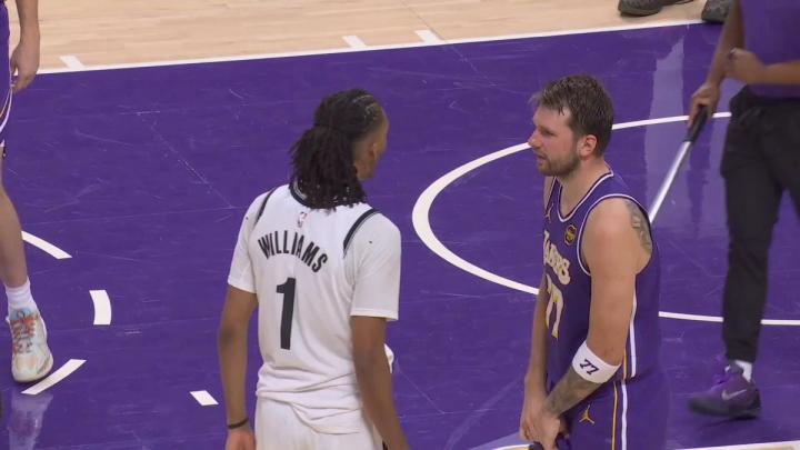 比赛进行到第三节还剩5分12秒时,湖人球星卢卡-东契奇和篮网球员扎伊尔-威廉姆斯爆发摩擦出现推搡,裁判分别给两人一个技术犯规。