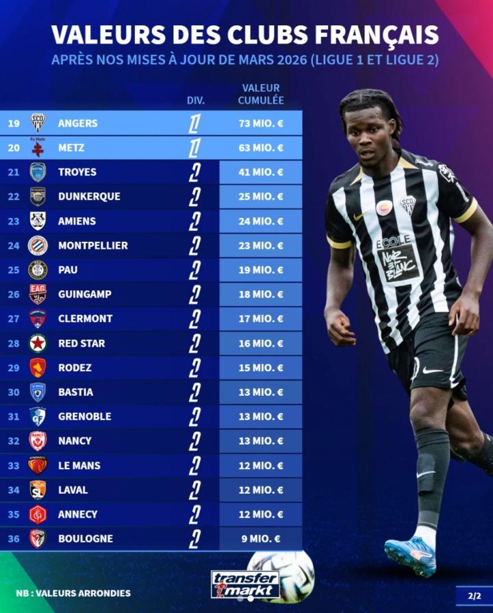 北京时间3月28日,德转列出了法甲+法乙合计36支球队最新的身价排行榜,巴黎圣日耳曼以12.1亿欧元断档第一,摩纳哥3.92亿欧元排名第二,马赛3.86亿欧元排名第三。