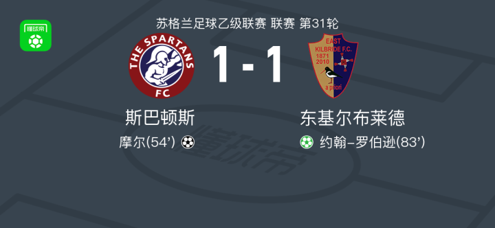 北京时间3月28日苏格兰足球乙级联赛 联赛 第31轮,斯巴顿斯主场对阵东基尔布莱德。斯巴顿斯摩尔破门。东基尔布莱德约翰-罗伯逊破门。最终比分斯巴顿斯 1-1 东基尔布莱德。