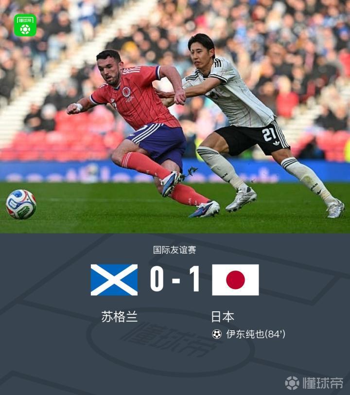 北京时间3月29日国际友谊赛,苏格兰对阵日本。下半场日本前场一连串短传配合,由伊东纯也完成破门。最终比分苏格兰 0-1 日本。