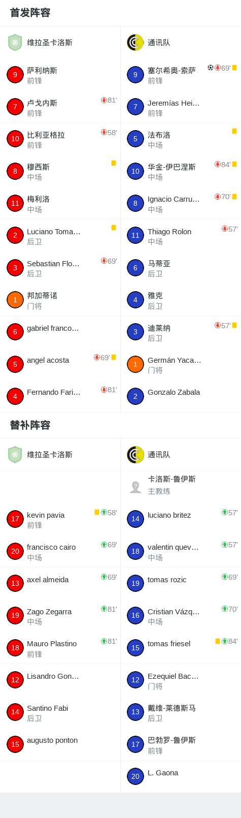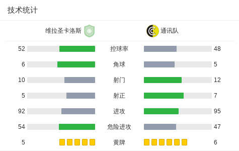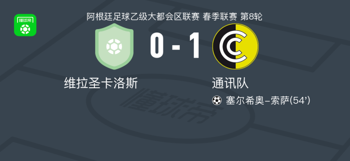 通讯队1-0维拉圣卡洛斯,塞尔希奥-索萨打进全场唯一进球战报bot @懂球帝03-29 02:56北京时间3月29日阿根廷足球乙级大都会区联赛 春季联赛 第8轮,维拉圣卡洛斯主场对阵通讯队。通讯队塞尔希奥-索萨破门。最终比分维拉圣卡洛斯 0-1 通讯队。点击查看本场比赛详细数据>>精彩瞬间第54分钟,通讯队球员塞尔希奥-索萨打入一球。 球队阵容 技术统计 展开更多