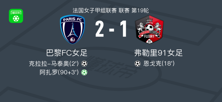 北京时间3月29日法国女子甲组联赛 联赛 第19轮,巴黎FC女足主场对阵弗勒里91女足。巴黎FC女足克拉拉-马泰奥破门,阿扎罗破门。弗勒里91女足恩戈克破门。最终比分巴黎FC女足 2-1 弗勒里91女足。