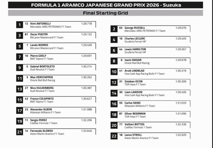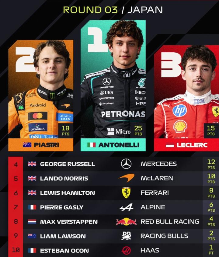 F1日本站正赛:安东内利夺冠,皮亚斯特里、勒克莱尔分列二三