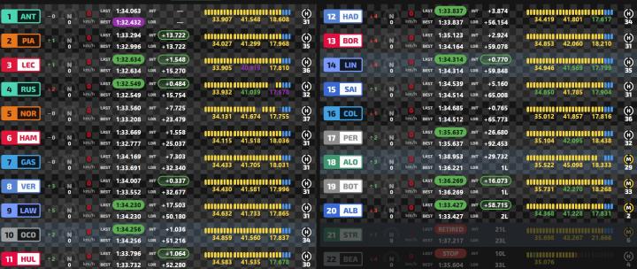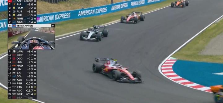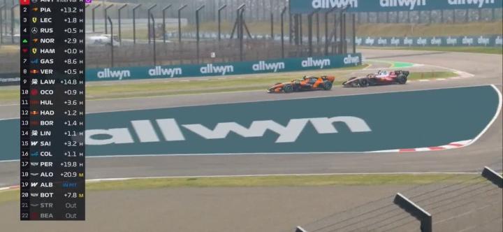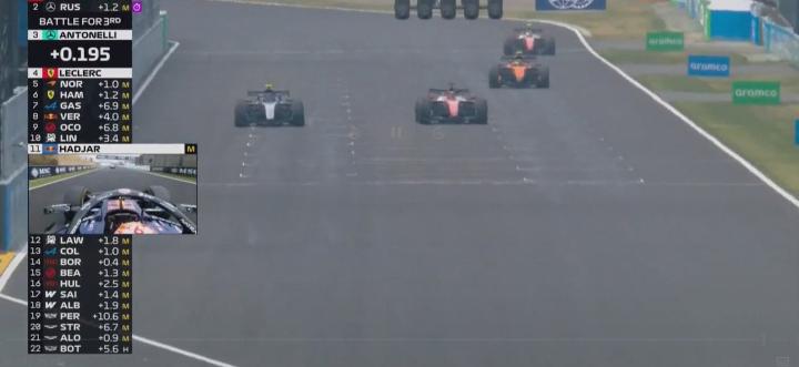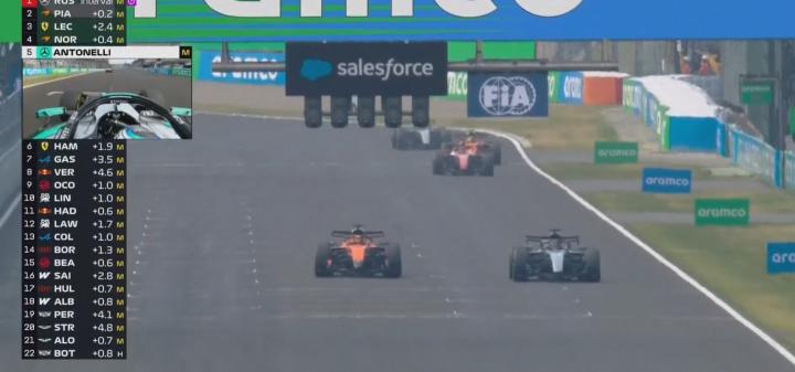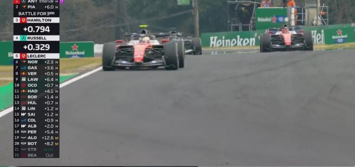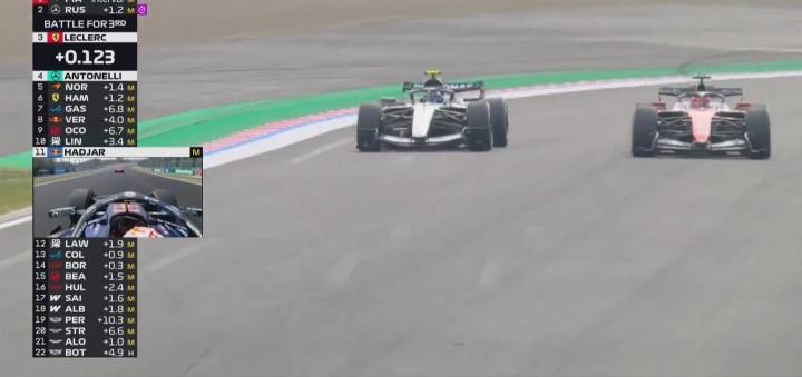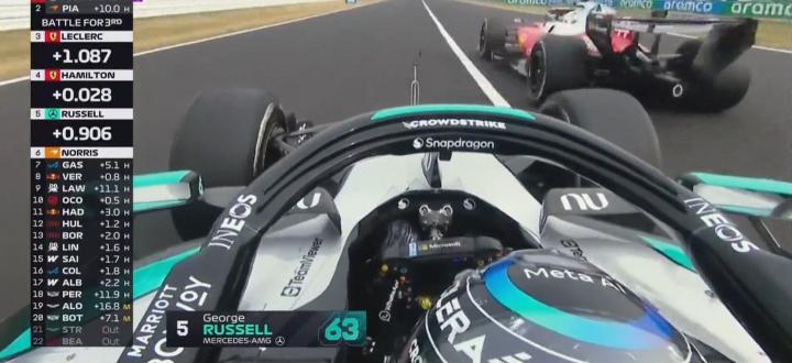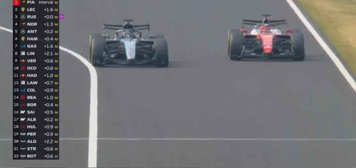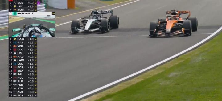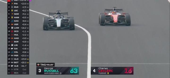 拉塞尔和皮亚斯特里用电策略不一,拉塞尔在S3杀进内线,皮亚斯特里在看台直路夺回领先。