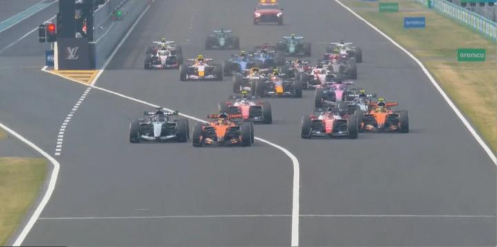梅赛德斯起步不利跌至P4、P5,被两台迈凯伦和勒克莱尔超越,皮亚斯特里领先。