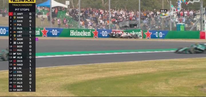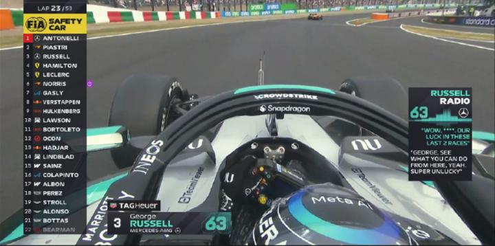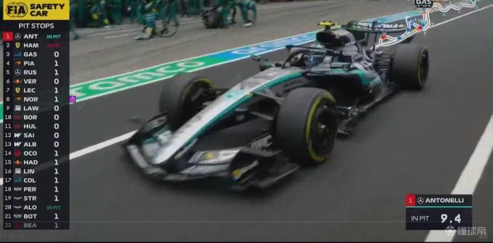 安东内利、汉密尔顿在安全车下伺机进站获得优势,出站分列第1、第4。拉塞尔无线电:我们运气真差。