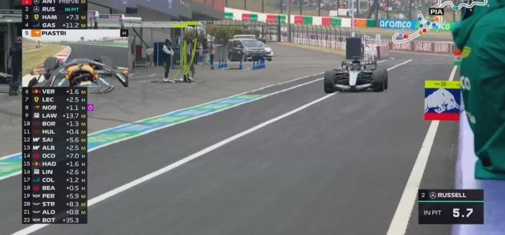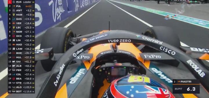 拉塞尔在干净空气里暂时领跑,随后进站落在皮亚斯特里身后。
