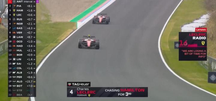 勒克莱尔超越汉密尔顿来到P3,拉塞尔随后在一号弯前超越汉密尔顿