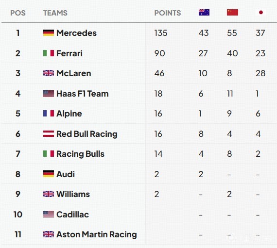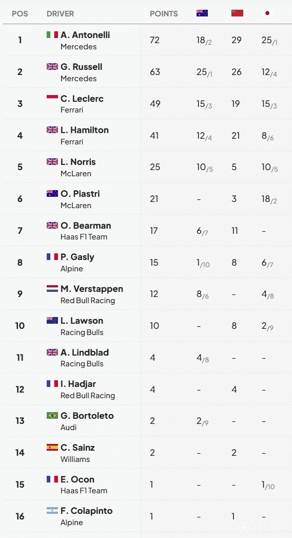 本站比赛后,安东内利超过拉塞尔登顶车手积分榜。勒克莱尔、汉密尔顿分列三四。