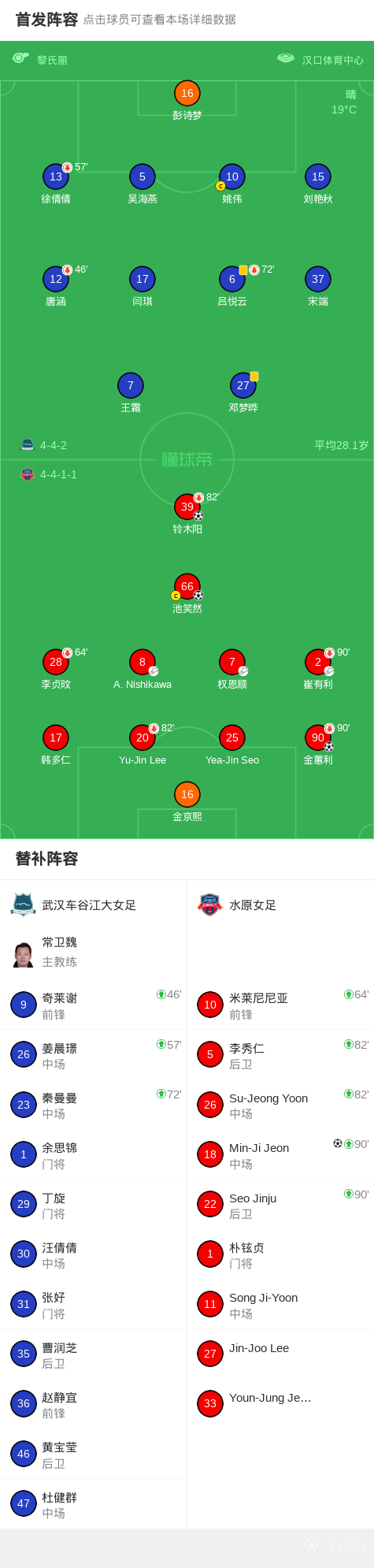 第12分钟,崔有利右路横传门前,池笑然拍马赶到推射破门,水原女足1-0