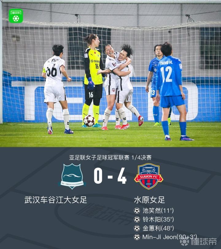 北京时间3月29日亚足联女子足球冠军联赛 1/4决赛,武汉车谷江大女足对阵水原女足。上半场,崔有利助攻池笑然破门,率先改写比分。邓梦晔进球被吹越位。随后,铃木阳破门将比分扩大。下半场,金蕙利抓住角球机会再进一球。补时最后阶段,赵敏姬补射破门锁定比分。最终,武汉车谷江大女足0-4不敌水原女足,无缘半决赛。