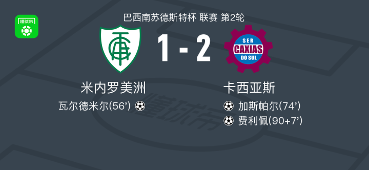 北京时间3月30日巴西南苏德斯特杯 联赛 第2轮,米内罗美洲对阵卡西亚斯。米内罗美洲瓦尔德米尔破门。卡西亚斯加斯帕尔破门,费利佩破门。最终比分米内罗美洲 1-2 卡西亚斯。
