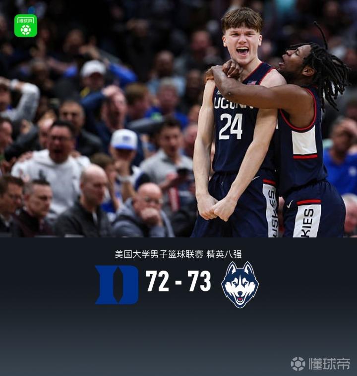 北京时间3月30日美国大学男子篮球联赛 精英八强,杜克大学对阵康涅狄格大学。半场杜克大学44-29领先康涅狄格大学,下半场开始,康涅狄格开始反扑,比赛最后关键时刻,手握两分优势的杜克出现失误,凯登-布泽尔在面对包夹时出球失误,康涅狄格大学球员布雷隆-马林斯运球至前场Logo直接出手超远三分,皮球入网后仅给杜克留下0.3秒完成准绝杀,最终杜克大学72-73不敌康涅狄格大学。