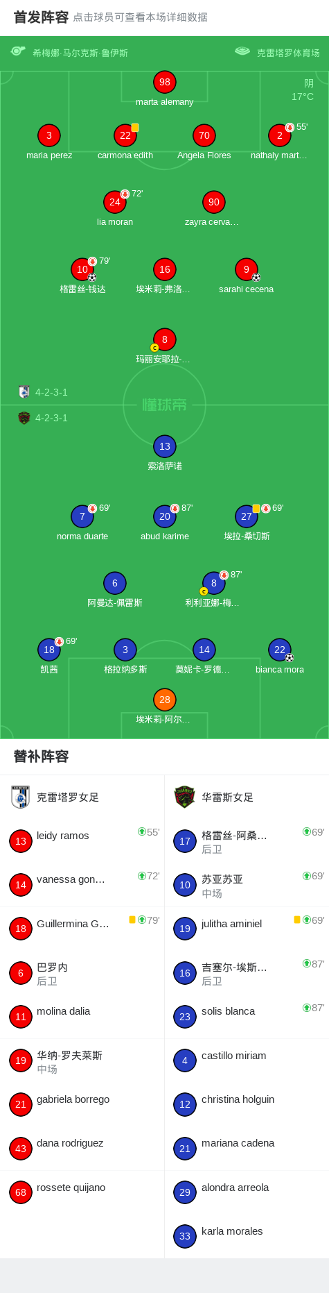 克雷塔罗女足2-1华雷斯女足,sarahi cecena破门,格雷丝-钱达建功
