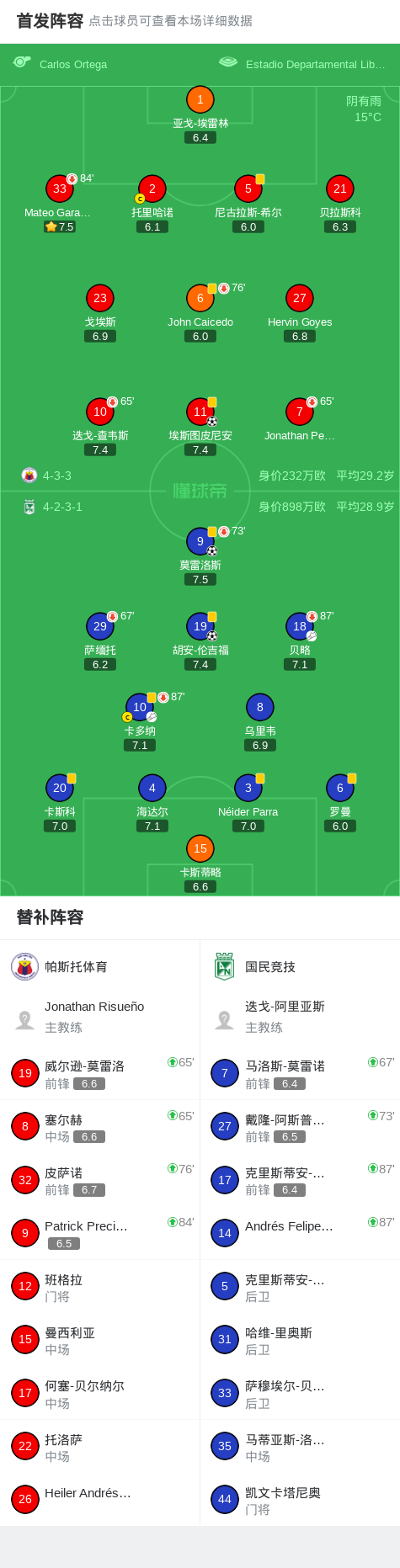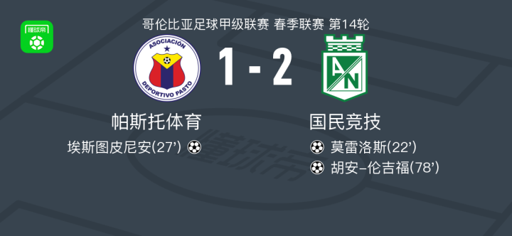 北京时间3月30日哥伦比亚足球甲级联赛 春季联赛 第14轮,帕斯托体育主场对阵国民竞技。帕斯托体育埃斯图皮尼安破门。国民竞技莫雷洛斯破门,胡安-伦吉福破门。最终比分帕斯托体育 1-2 国民竞技。