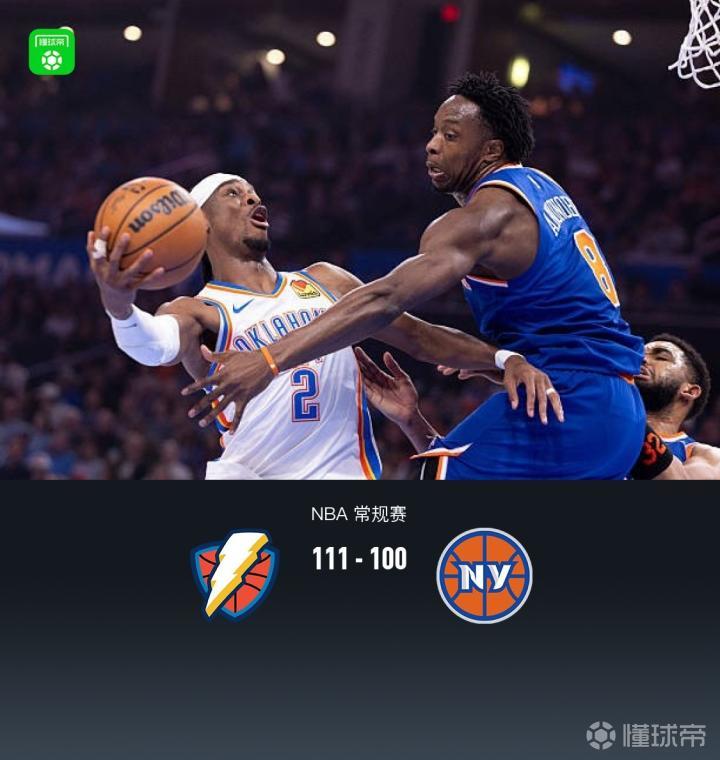 第四节雷霆亚历山大拿下10分,尼克斯唐斯拿下9分,最终雷霆111-100战胜尼克斯