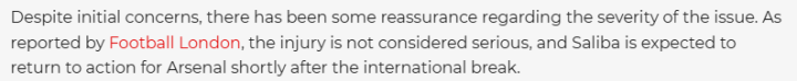 尽管最初令人担忧,但目前情况已有所好转,伤情并不严重。据《伦敦足球》报道,萨利巴的伤势并不严重,预计他将在国际比赛日结束后不久就能重返阿森纳赛场。