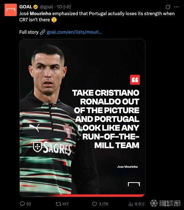 今天早上,出现了一则穆里尼奥谈C罗的新闻,称由于葡萄牙友谊赛0-0战平墨西哥,穆帅评论道:“如果C罗不在阵中,葡萄牙就只是一支普通球队”。这篇新闻的信源是Goal平台。(原文:穆里尼奥:如果C罗不在阵中,葡萄牙队就只是一支普通的球队)