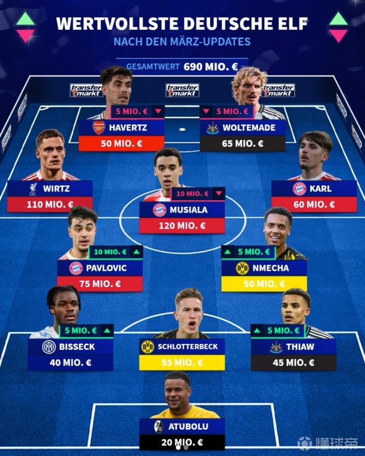 北京时间3月30日,在更新了欧洲五大联赛球员的身价之后,德转列出了德国球员最贵11人阵容,身价1.2亿欧元的穆西亚拉和1.1亿欧元的维尔茨领衔。