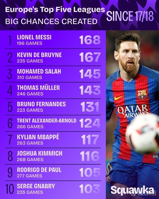 北京时间3月30日,Squawka在社媒列出了自2017/18赛季以来,五大联赛中创造绝佳机会最多的前十位球员榜单。虽然在2023年夏天转投美职联迈阿密国际,但梅西依然以创造绝佳机会168次,领先德布劳内1次的数据,荣膺此榜单榜首。
