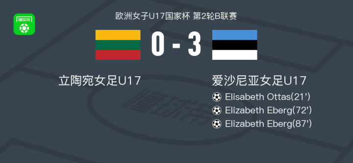 北京时间3月30日欧洲女子U17国家杯 第2轮B联赛,立陶宛女足U17对阵爱沙尼亚女足U17。爱沙尼亚女足U17Elisabeth Ottas破门,Elizabeth Eberg梅开二度。最终比分立陶宛女足U17 0-3 爱沙尼亚女足U17。