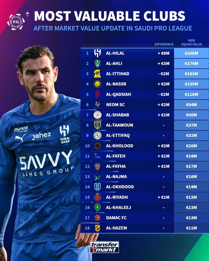 北京时间3月30日,德国转会市场公布了沙特球员的最新身价,随后,他们列出了沙特联赛球队身价排名,其中利雅得新月居首,吉达国民第二,吉达联合排名第三。