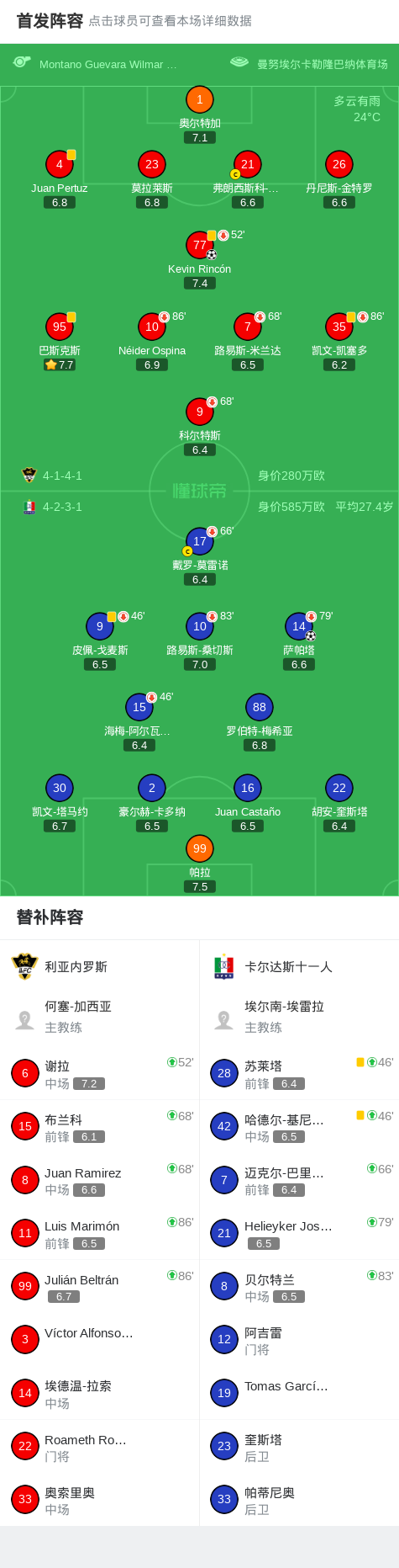 北京时间3月30日哥伦比亚足球甲级联赛 春季联赛 第14轮,利亚内罗斯主场对阵卡尔达斯十一人。利亚内罗斯Kevin Rincón破门。卡尔达斯十一人萨帕塔破门。最终比分利亚内罗斯 1-1 卡尔达斯十一人。
